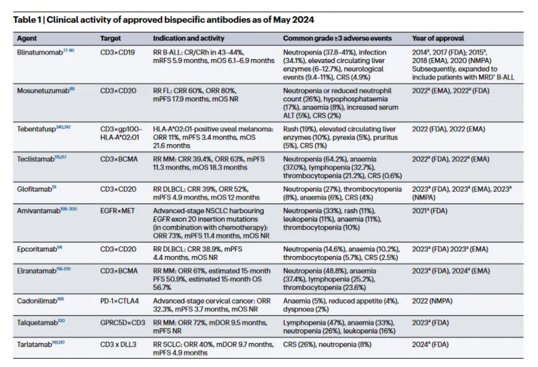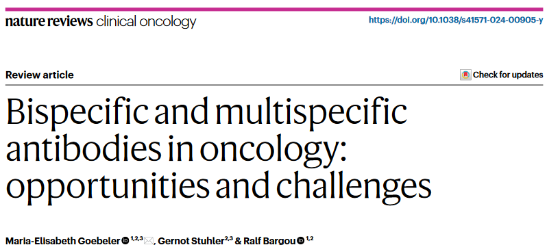 在這篇綜述中,德國維爾茨堡大學(xué)醫(yī)院Maria-Elisabeth Goebeler等人討論了雙特異性抗體在癌癥患者中的作用,包括歷史和發(fā)展,以及創(chuàng)新的靶向策略、臨床應(yīng)用和不良事件。此外,作者還討論了新的替代雙特異性抗體構(gòu)建體,例如那些靶向腫瘤細(xì)胞或位于腫瘤微環(huán)境中的細(xì)胞表達(dá)的兩種抗原的構(gòu)建體。最后,作者還介紹了這一快速發(fā)展領(lǐng)域的未來研究方向,包括創(chuàng)新的抗體工程策略,這有望使藥物遞送更有效、克服耐藥性,從而優(yōu)化臨床結(jié)果。相關(guān)工作以“Bispecific and multispecific antibodies in oncology: opportunities and challenges”為題發(fā)表在Nature Reviews Clinical Oncology。