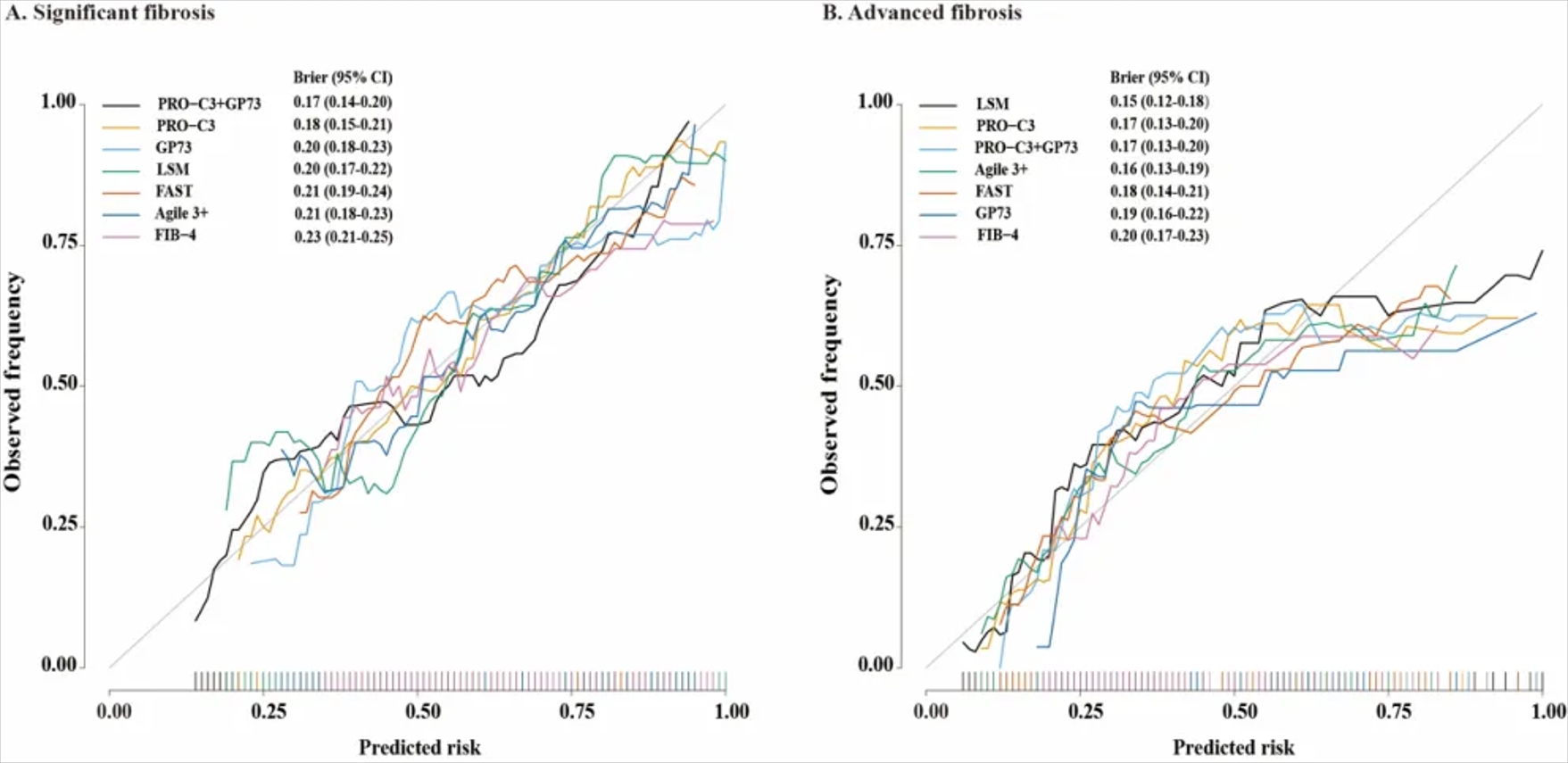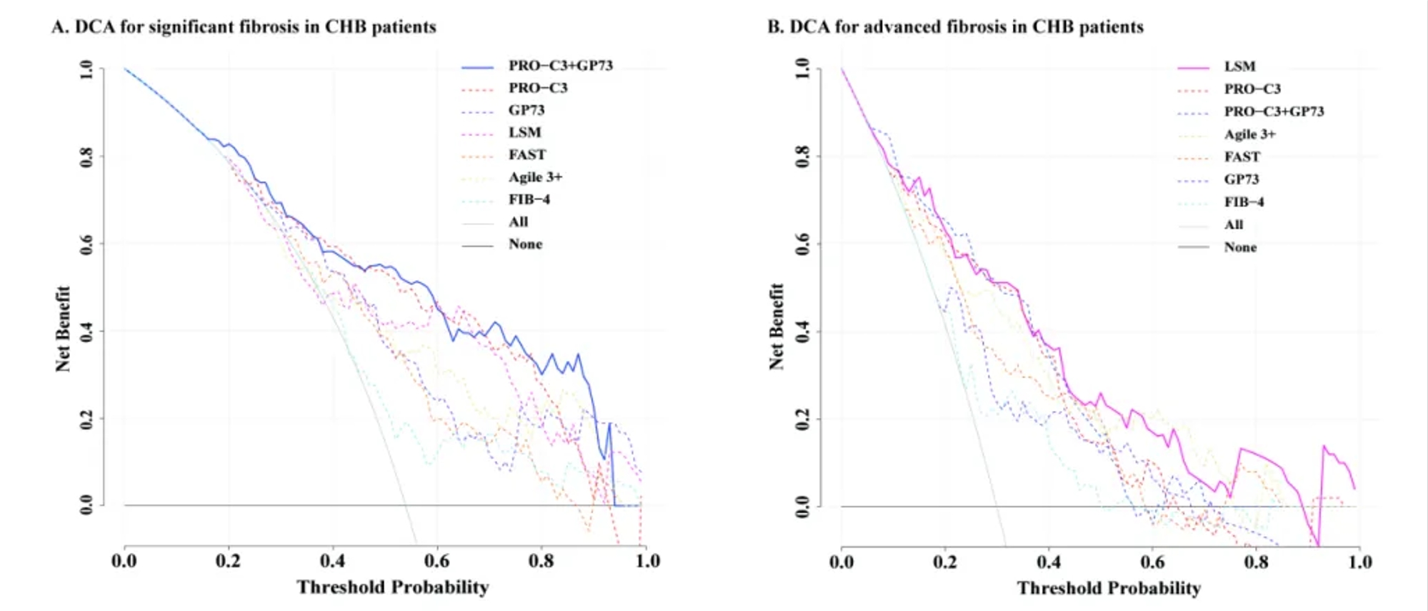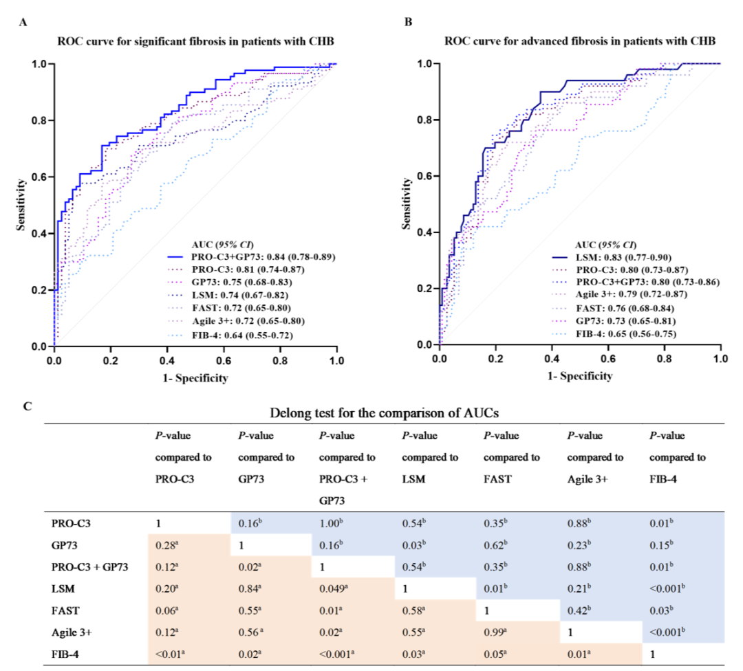 圖1. 不同無創(chuàng)檢測預(yù)測慢性乙型肝炎患者纖維化效能的ROC曲線。(A)顯著纖維化;(B)進(jìn)展期纖維化