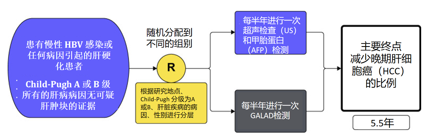 為了驗證GALAD模型在真實世界中的臨床應(yīng)用效果,美國國家癌癥研究所(NCI)牽頭開展了TRACER試驗。TRACER 研究是一項實用的隨機 IV 期試驗,旨在比較基于超聲的篩查與生物標(biāo)志物組合 GALAD 在患有慢性 HBV 感染或任何病因引起的肝硬化患者中的應(yīng)用。簡而言之,5500 名患者以 1:1 的方式隨機分配到 A 組,建議每半年進(jìn)行一次超聲 ± AFP 篩查,或 B 組,建議每半年進(jìn)行一次 GALAD 篩查。按地點、Child-Pugh 分級(A 與 B)、肝病病因(病毒性、非病毒性和非肝硬化性 HBV 感染)和性別進(jìn)行隨機分層。通過對比兩組的結(jié)果,研究人員希望能夠確定哪種方法能更好地減少晚期肝癌的發(fā)現(xiàn)率,并改善患者的治療效果。