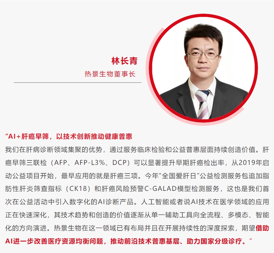 3月18日,值第25個“全國愛肝日”期間,“2025肝癌防治健康中國行——全國愛肝日”大型公益義診活動在全國30省份近百家醫(yī)院的協(xié)同下聯(lián)合展開,惠及近萬人次,公益健康服務(wù)包(肝癌三項、GP73、CK18-M30/M65等)由熱景生物支持。2025年升級版“肝病全周期健康檢測服務(wù)包”首次融合數(shù)智化AI診斷模型,探索“AI+創(chuàng)新診療”公益新模式,通過智能算法提升肝癌篩查效益,助力實現(xiàn)"篩查-診斷-干預"全流程精準管理,全面推動肝癌防治邁入數(shù)智化新階段。