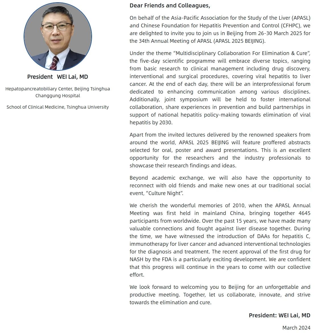 第34屆亞太肝病學(xué)會年會(APASL 2025)將于2025年3月26-30日在北京國家會議中心隆重舉行。大會以"多學(xué)科協(xié)作:肝病消除與治愈"(Multidisciplinary Collaboration For Elimination & Cure)為主題,由清華大學(xué)附屬北京清華長庚醫(yī)院魏來教授擔(dān)任主席,將匯聚全球肝病學(xué)頂尖專家,共同構(gòu)建跨學(xué)科協(xié)作的創(chuàng)新范式。